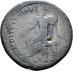 Zeus seated left holding patera (?) in his extended right arm, left resting on sceptre
