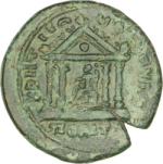 temple with four columns enclosing statue of Zeus seated, left, holding patera and resting on sceptre; pellet in pediment