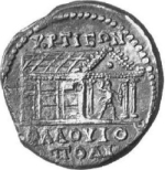 temple with four columns seen from three-quarter right, within which statue of Artemis