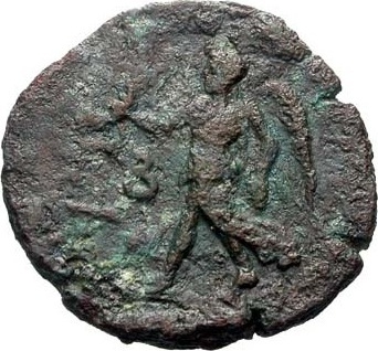 Nike advancing left, holding wreath and palm