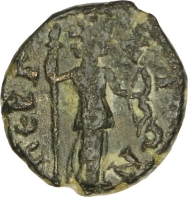 Artemis standing right, wearing radiate crown, holding long torch and bow