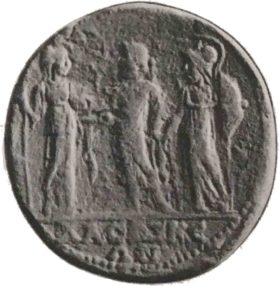 Athena standing, left, holding spear and shield; in front of her Zeus, standing left, holding eagle and sceptre, facing Tyche standing, right, holding sceptre and patera