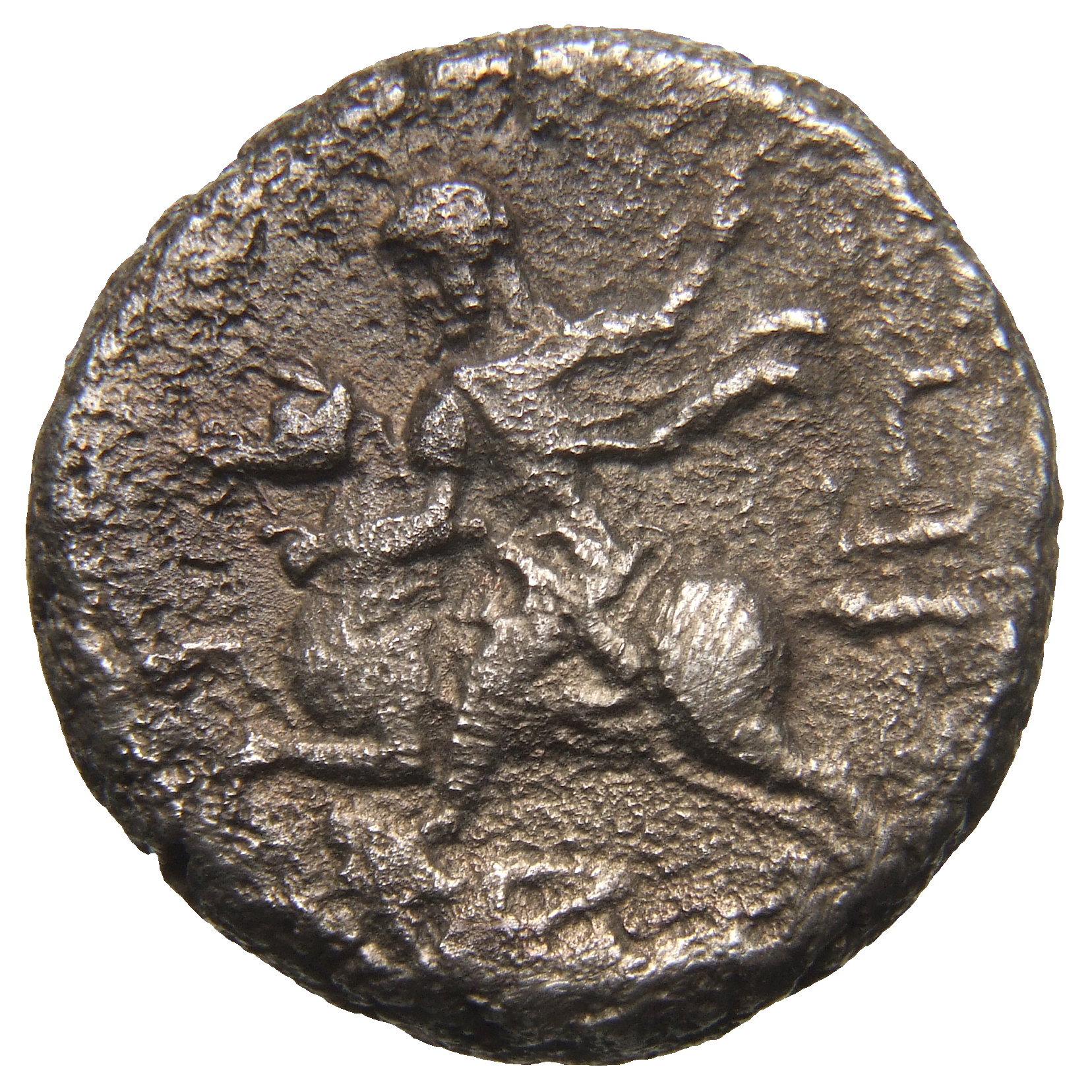Emperor, in military dress, galloping left, holding reins and spear, below captive with Phrygian hat