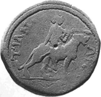 Dionysus riding on panther, right, his right arm resting on panther, holding long thyrsus on his left shoulder; below, cantharus with ivy leaves