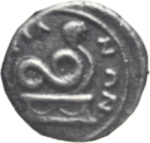 serpent with human face (Glykon), head erect, on garlanded base, right