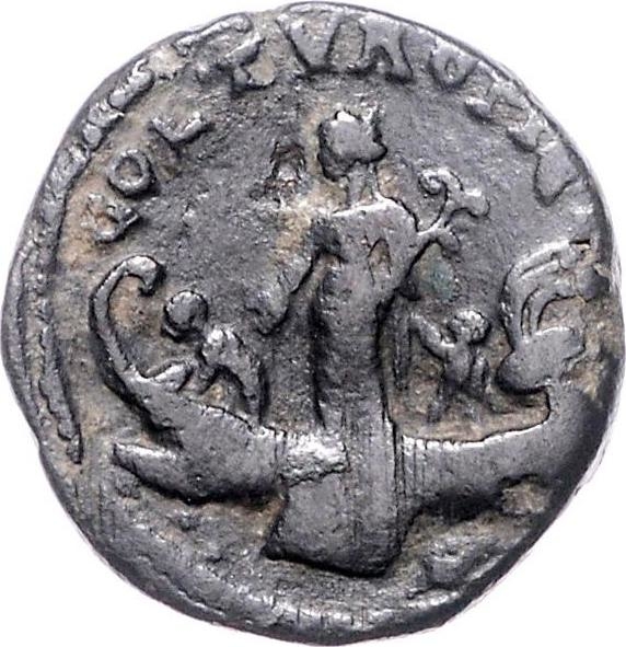Dido in galley left holding cornucopia in left (?) reaching down toward smaller figure; behind, a second figure reaching up to he; in ex., on either side of oars descending from the galley, two murex shells (?)