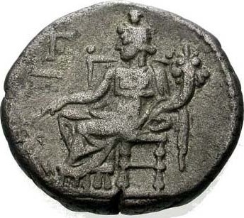 Tyche enthroned left, holding rudder in right hand and cornucopia in left hand
