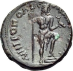 Poseidon standing right, holding trident and dolphin, foot on prow