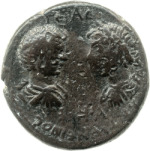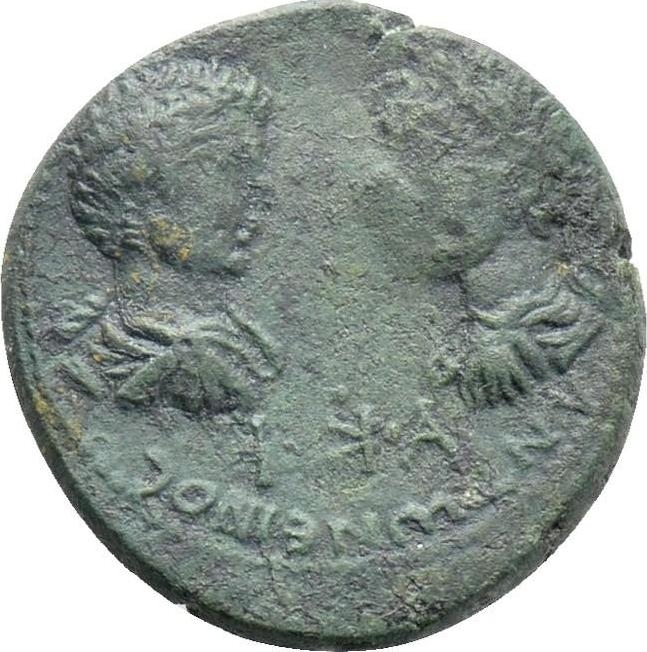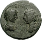bare-headed, draped and cuirassed bust of Geta, right, seen from rear, facing laureate, draped and cuirassed bust of Caracalla, left, seen from rear