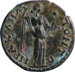 Aphrodite standing facing, head right, draping herself peplos over right shoulder and holding apple in left