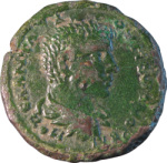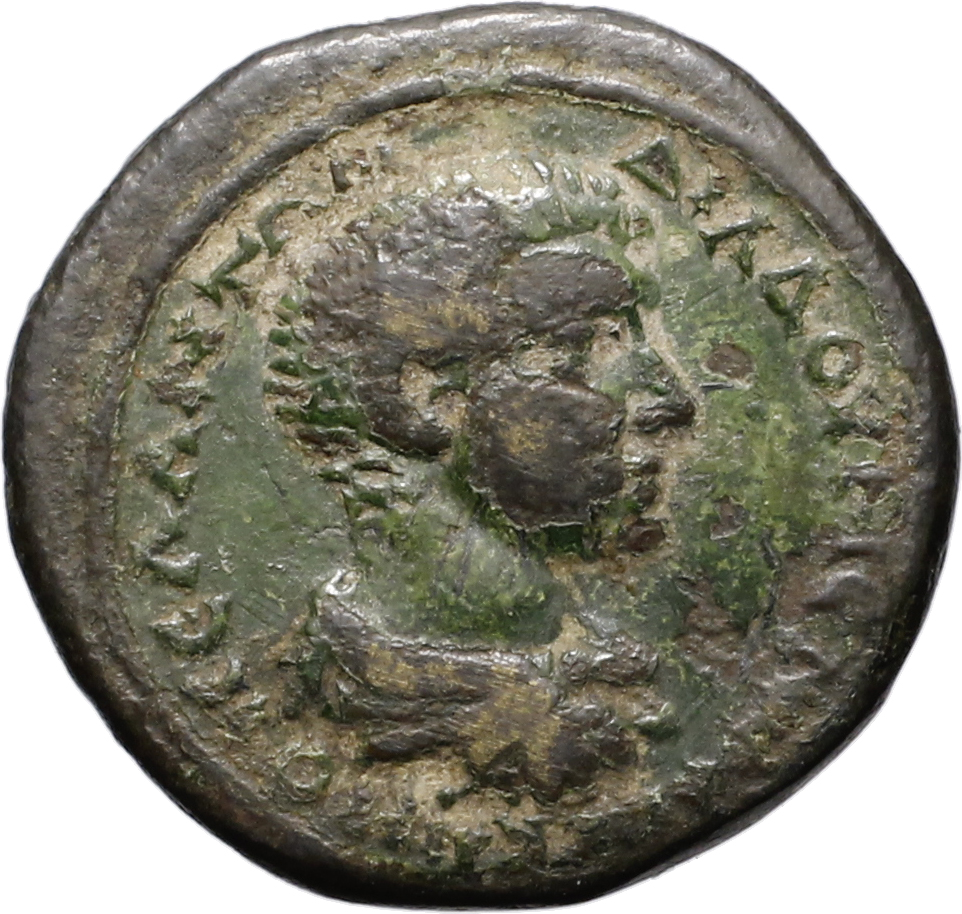 bare-headed, draped and cuirassed bust of Diadumenian, right, seen from rear
