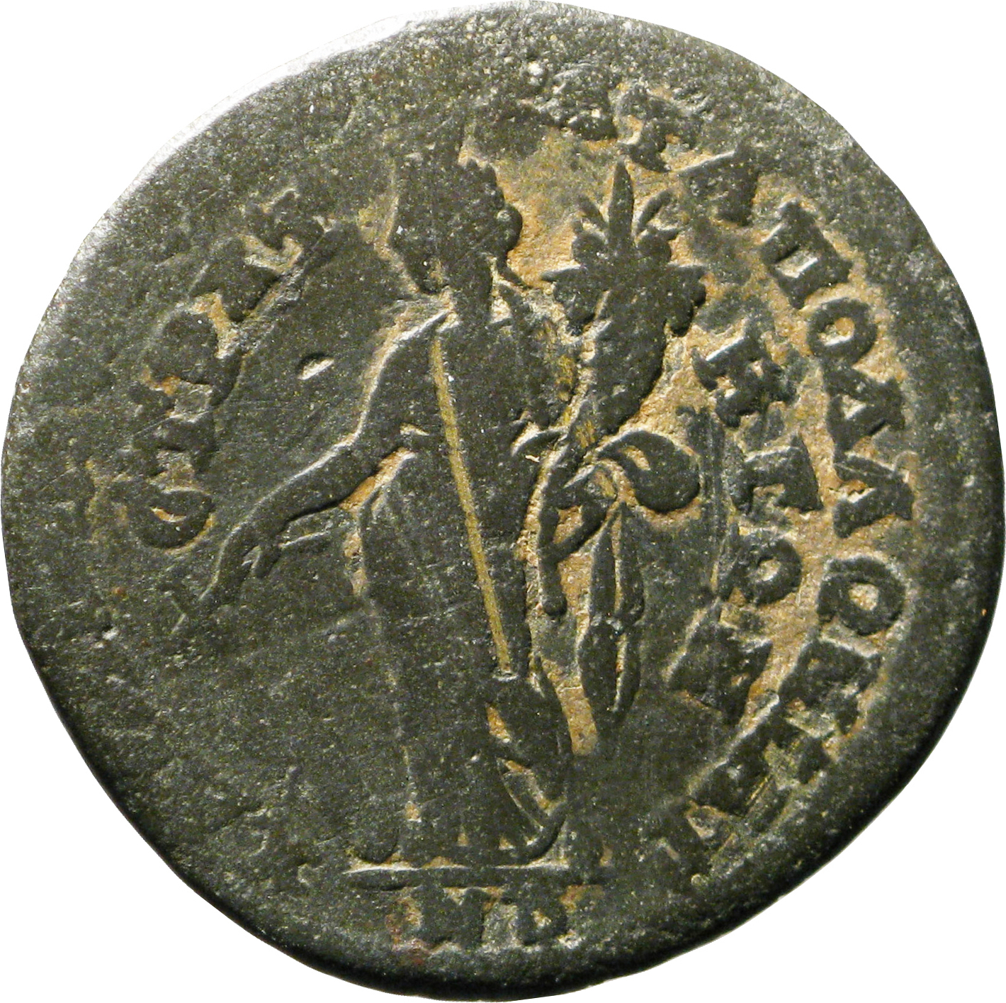 Tyche standing facing looking left, wearing kalathos, holding rudder and cornucopia |