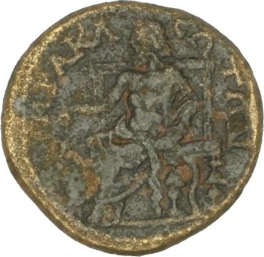 Asclepius seated on throne, left, staff in his left hand, his right hand towards a serpent in front of him
