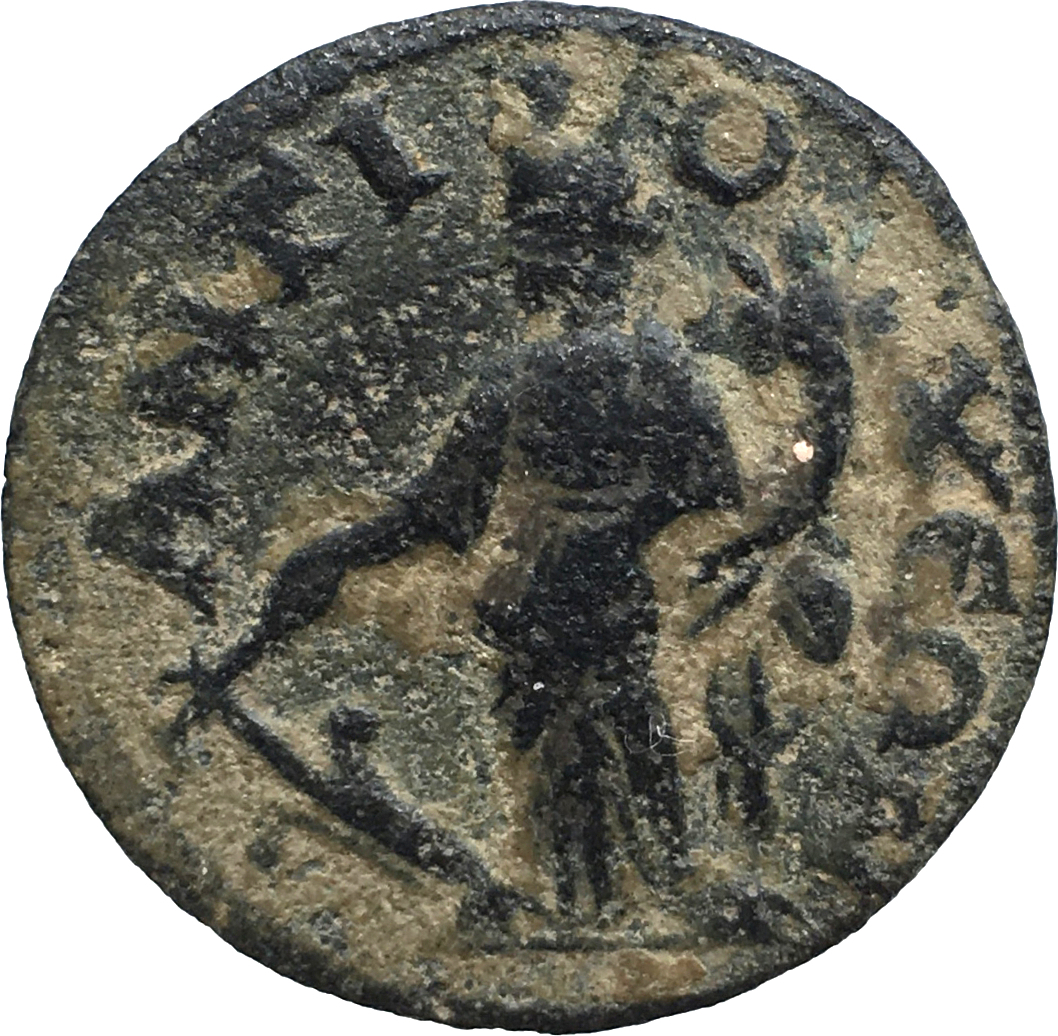 Tyche standing left, holding rudder and cornucopia