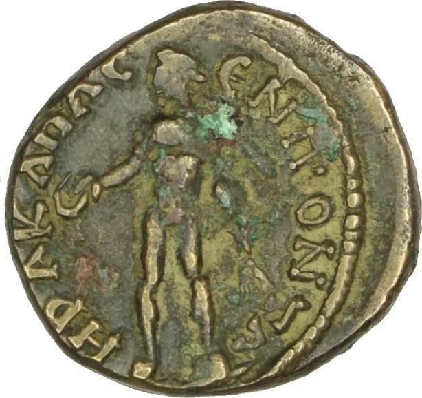 male nude figure standing facing, head left, holding patera in his right hand and ears of corn in his left
