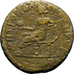 Tyche seated left, holding out prize crown with palm, and resting arm on anchor