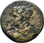 Emperor, laureate and in military dress, standing facing, head left, holding patera and sceptre; (to left, altar)