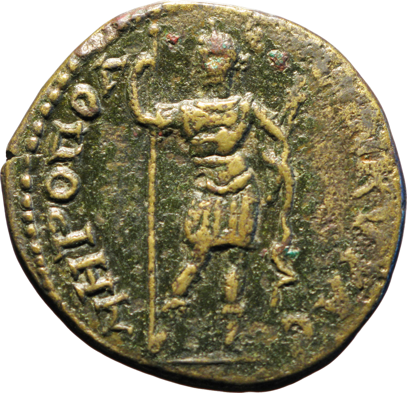 Emperor, laureate and in military dress, standing facing, head left, holding sceptre and serpent (?)