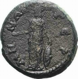 Athena standing, left, holding patera, resting arm on shield; beside, upright spear
