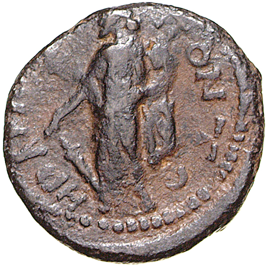 Tyche standing left holding rudder and cornucopia