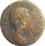 bare-headed, draped and cuirassed bust of Geta, right, seen from rear