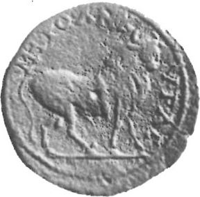 bull standing right, with fillet (?) between horns