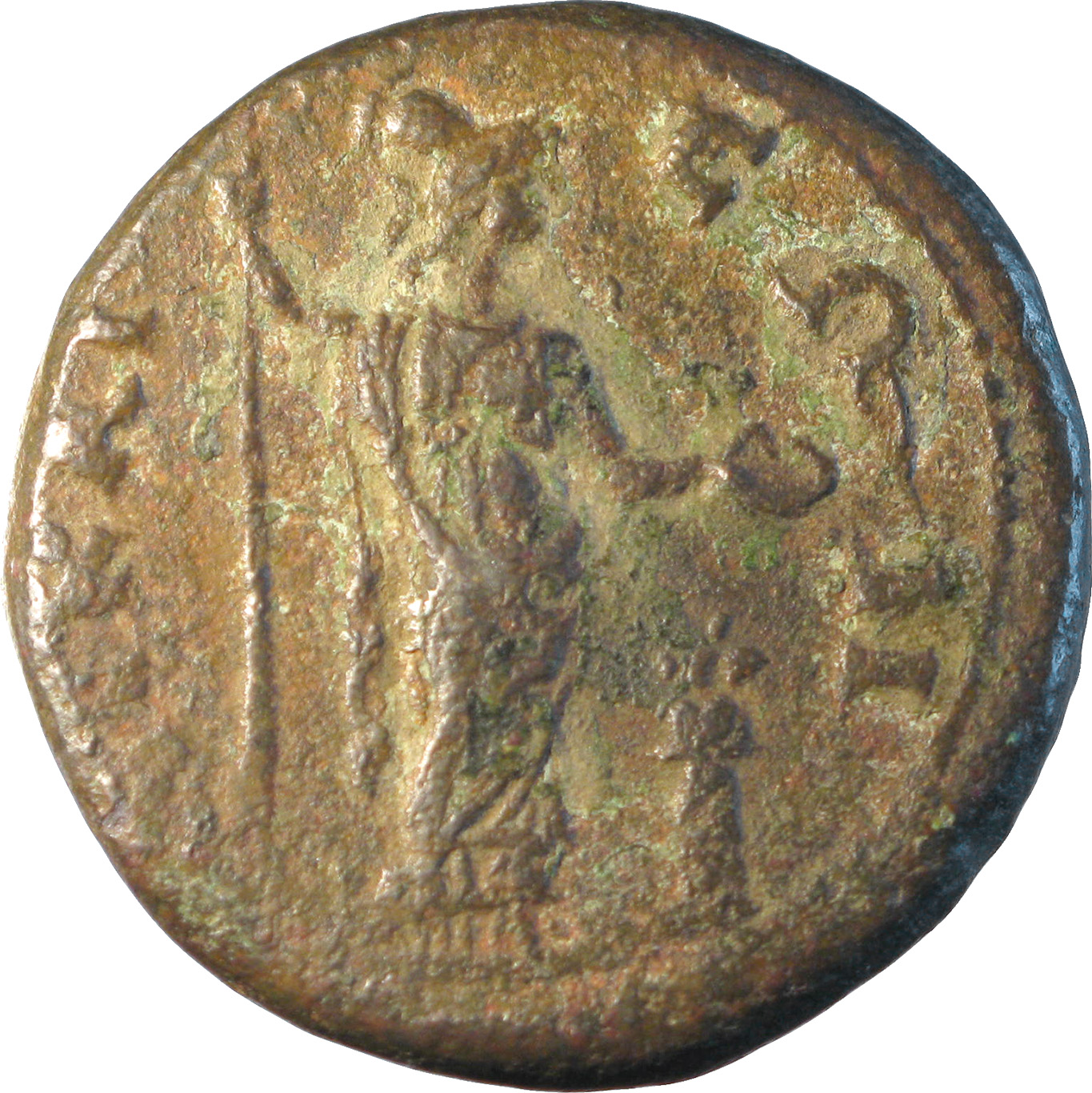 Athena standing right, holding spear and patera over lighted altar