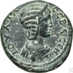 Tyche (?), head left and holding cornucopia, seated on lion, walking right; to left, anchor