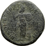 Athena standing facing, head right, resting on spear with her right and holding shield on her left arm; at her feet, right, lighted altar