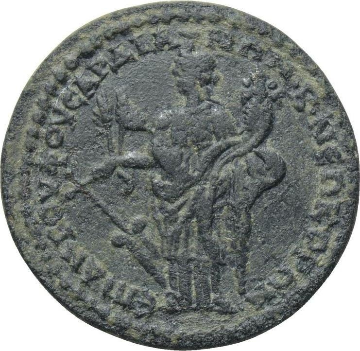 Tyche standing left, holding rudder with two ears of corns and cornucopia