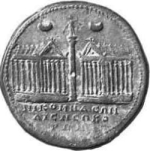 two temples with six columns facing each other, seen from a three-quarter view; globe in each pediment; between them, column surmounted by statue of a male figure (emperor?) resting on sceptre with his left