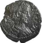 Tyche standing left, head turn right, holding rudder and cornucopia