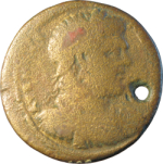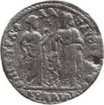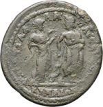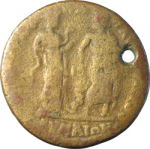 Hygieia standing right, feeding serpent from patera, facing Asclepius standing facing, head left, holding serpent staff |