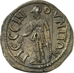 Athena standing facing, head left, holding patera (?) and spear, left hand resting on shield