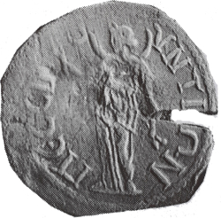 Selene (?) with crescent at shoulders, standing facing, head left, holding up branch (?) and uncertain object