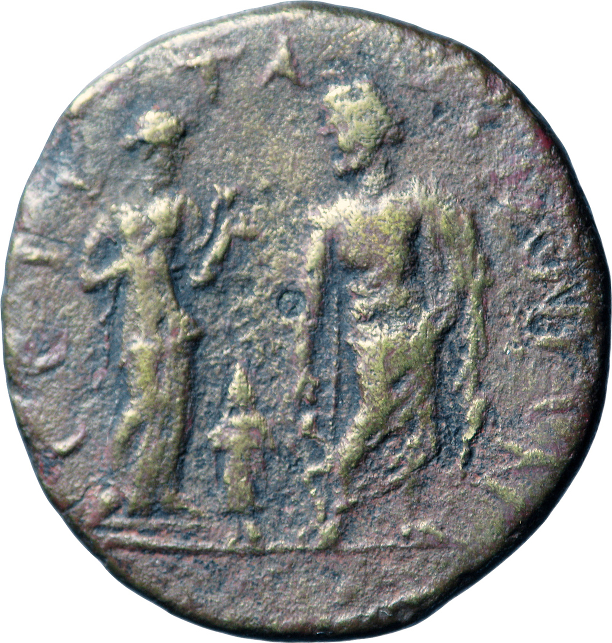 Hygieia standing facing, head right, feeding serpent; Asclepius standing facing, head left, resting on serpent-staff; between, Telesphorus