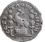 eagle standing on altar left, head right holding wreath in beak; between two standards