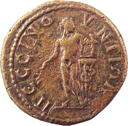 Apollo standing facing, head right, holding branch and resting lyre on column