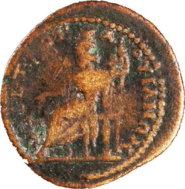 "turreted Tyche seated l. holding scepter in l. hand and extending r. toward small griffin sitting at her feet."