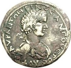 laureate, draped and cuirassed bust of Caracalla, right, seen from front