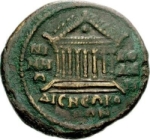 temple with eight columns on podium; pellet in pediment
