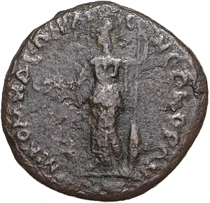 Athena standing facing, head left, holding patera in her right hand over lighted altar, her left resting on spear; shield at her feet, right