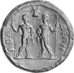 two Dioscuri standing facing, nude, heads turned towards each other, holding sceptres; above, bucranium