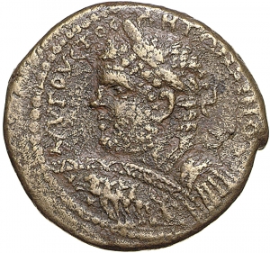 laureate and cuirassed bust of Caracalla, left, seen from front, holding spear pointing forward and shield ornamented with quadriga driven by Nike