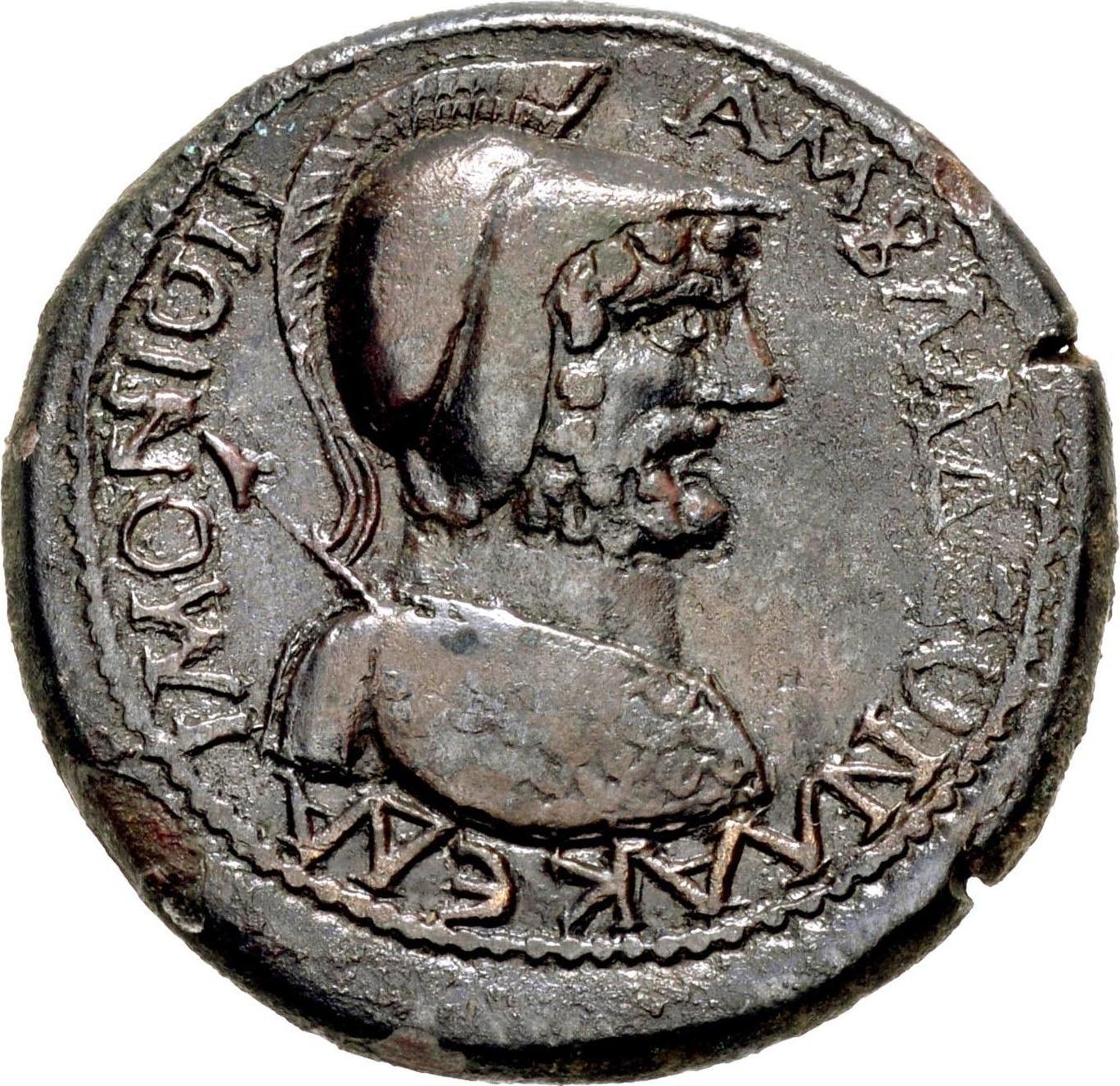 Ares, draped bust right, wearing helmet and holding spear over shoulder