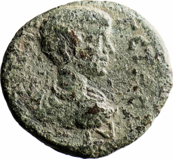 bare-headed, draped and cuirassed bust of Geta, right, seen from rear