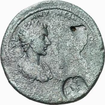GIC 84 (Caracalla, laureate bust r.) ; Geta erased; cmk could be head of Domna with inscription ΔΟΜ?