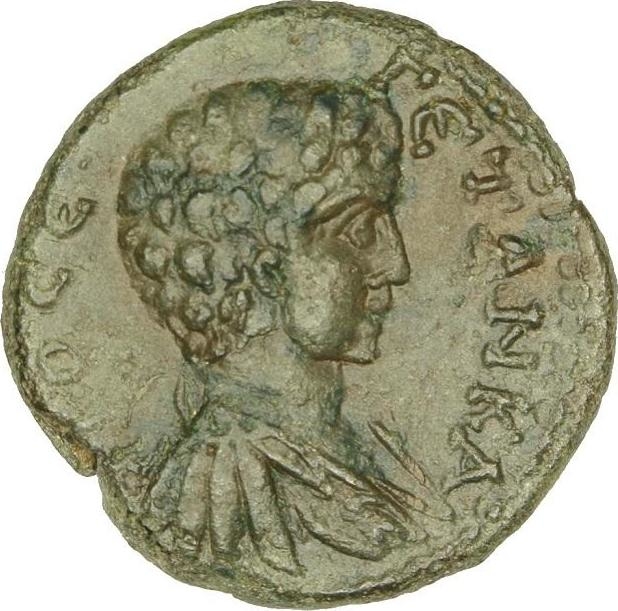 bare-headed, draped and cuirassed bust of Geta, right, seen from front