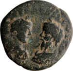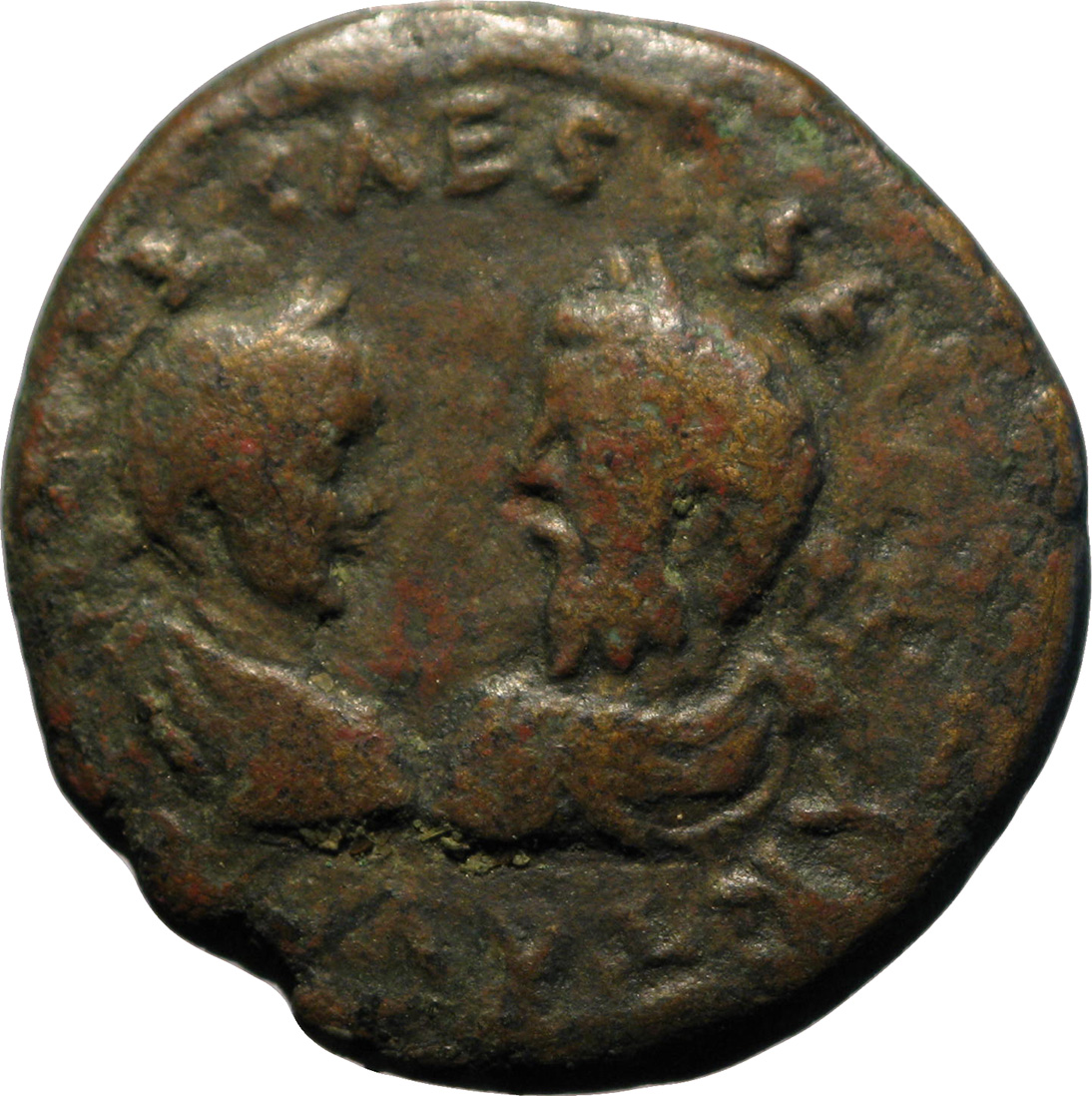 laureate, draped and cuirassed bust of Caracalla, right, seen from rear, facing laureate, draped and cuirassed bust of Septimius Severus, left, seen from rear
