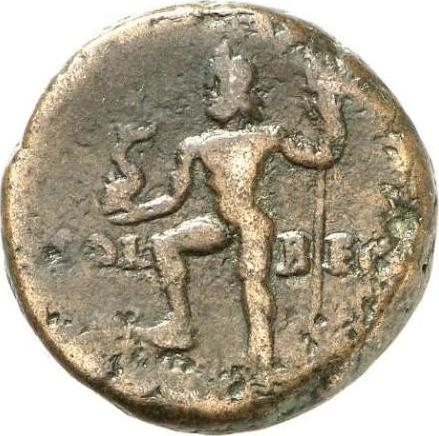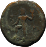 Poseidon nude standing left, right foot on rock, holding dolphin in right hand, left hand resting on trident
